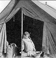 Six-year-old Alice in front of her tent, in her traveling clothes.