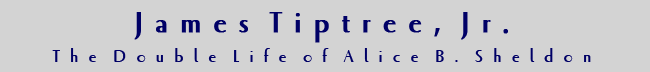 | “Alice Sheldon shall appeal to the masses in the year 2017.” –Roberto Bolaño, Amulet She was born in Chicago in 1915. As a child, she crossed Africa with her explorer parents. As an adult, she became a painter, a military intelligence officer, a CIA agent, an experimental psychologist. At age 51, Alice Bradley Sheldon made yet another change of career. James Tiptree Jr. began writing science fiction in 1967. His stories were fast-paced and hard-boiled, his letters funny, frank, and sensitive. No one had ever seen him. No one knew his true identity. There were rumors he was a government spy. It wasn't until 1976 that the cover was blown on his alter ego: Alli Sheldon, a complex woman with an unusual past. Alli Sheldon's use of a male voice not only demolishes assumptions about writing and gender, it also speaks to the mystery of the writing persona. Why could she only tell the truth about herself when she became someone else? On this website you can find a few excerpts from James Tiptree, Jr., illustrated with images from the book plus new photos.