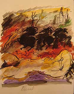 A watercolor, possibly a study for a mural. Another in the same series shows soldiers marching beneath a monstrous caricature of Hitler.