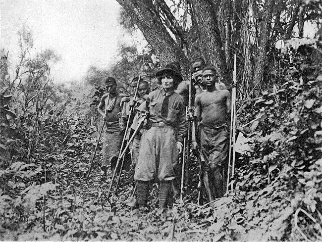 Mary Bradley, gun bearer, and guides, hunting gorillas. The gorillas the party shot are still on view in New York City's American Museum of Natural History.