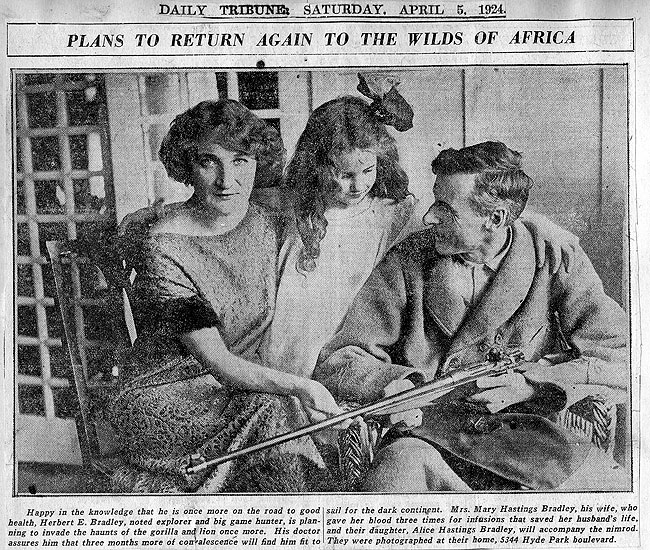 In 1921-22, the Bradleys made their first trip to Central Africa. Traveling with the hunter and naturalist Carl Akeley, they went to the eastern Congo to study and hunt mountain gorillas.
